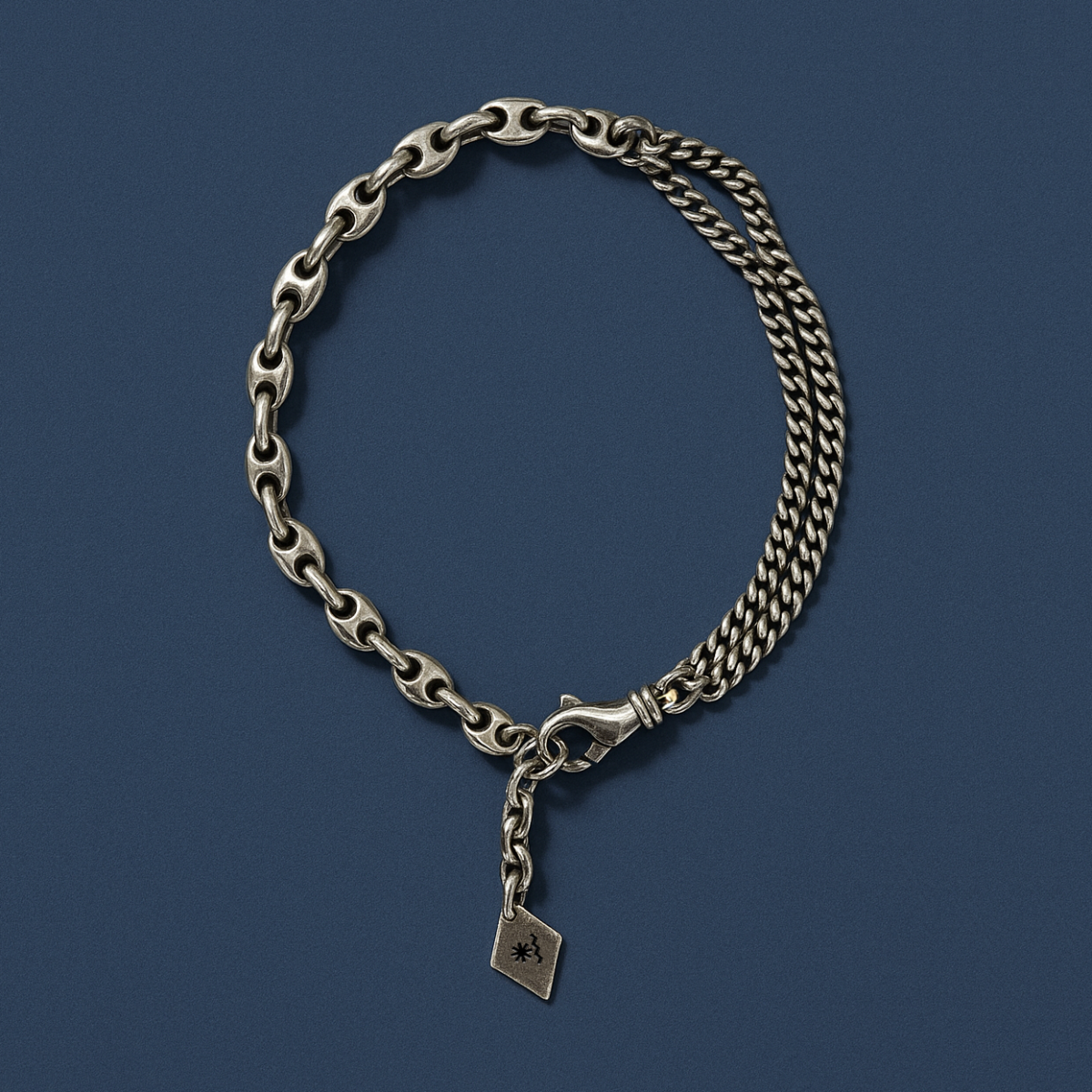 Imaginez l'alliance audacieuse de trois mailles iconiques, la fine gourmette, la belle grain de café et la classique forçat, rassemblées sur un seul et même bracelet de 4 mm de largeur. Ce mélange subtil crée un jeu de lumière et de texture absolument fascinant à votre poignet. C'est l'accessoire idéal pour celles et ceux qui veulent un look affirmé, sans en faire trop.